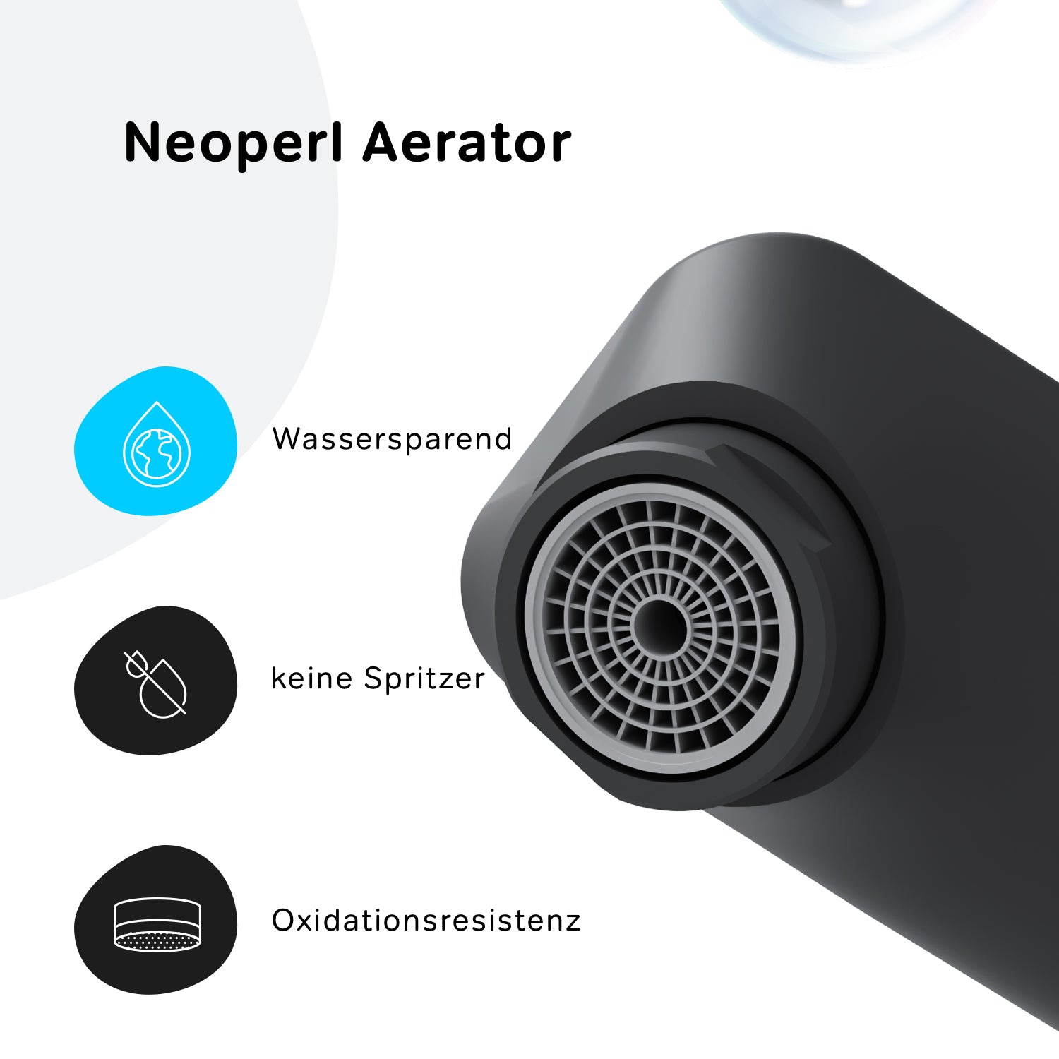 Neoperl Aerator verwendet eine Wasserspar-Technologie ohne Spritzwasser, indem er Wasserstrahl mit Luft mischt.