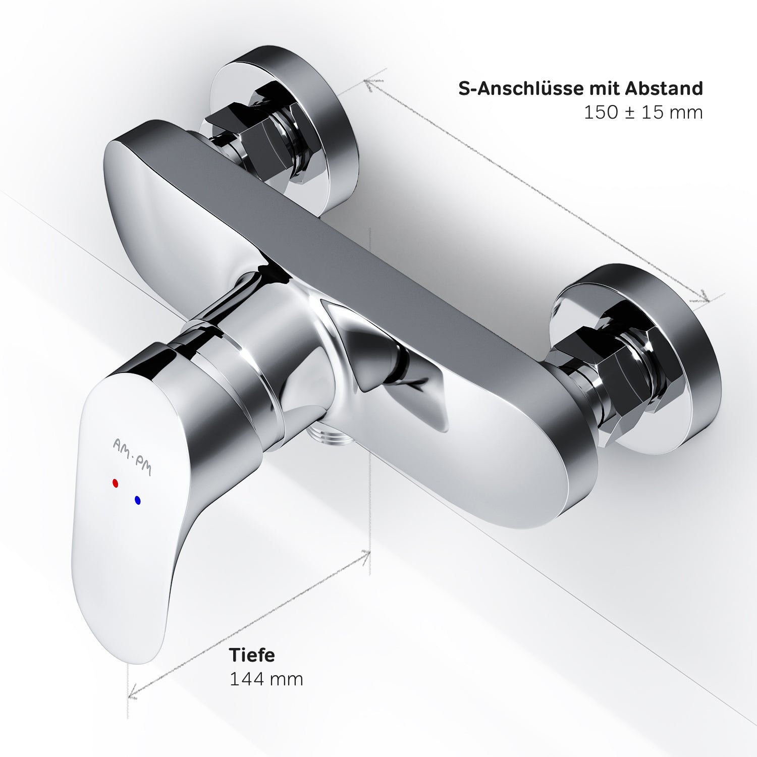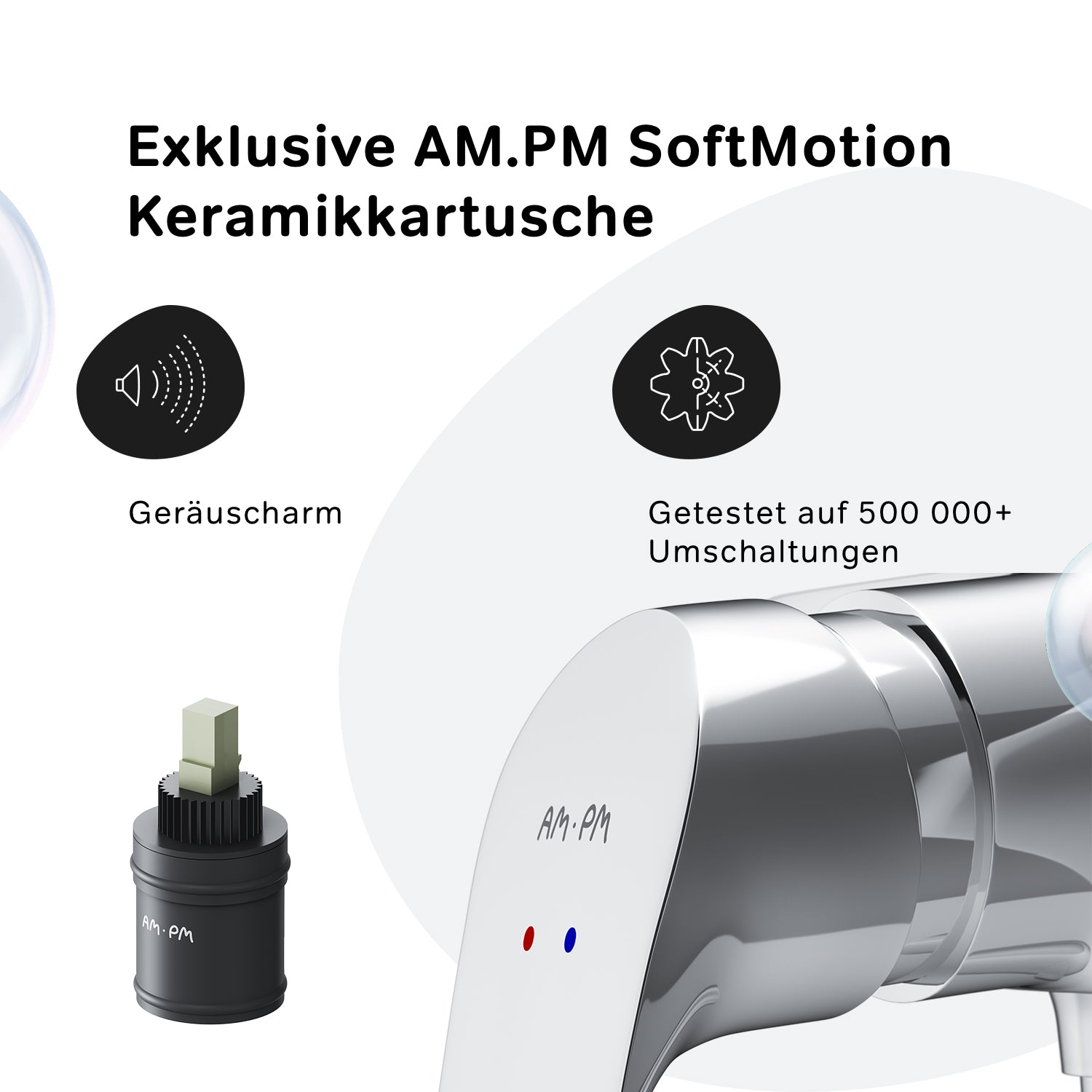 Die einzigartige Form des Griffs lässt Wassertropfen abperlen, damit sie sich nicht auf der Oberfläche ablagern und austrocknen. Exklusive Entwicklung: Speziell designt für die AM.PM-Keramikkartusche SoftMotion 35 mm, die die Temperaturregelung ausgleicht und außerdem einen optimalen Druckabfall ermöglicht. Akkurate Technik für Ihren Komfort: Dank des großzügigen Bewegungsbereichs ist der Regler für die Wassertemperatur noch einfacher zu bedienen.