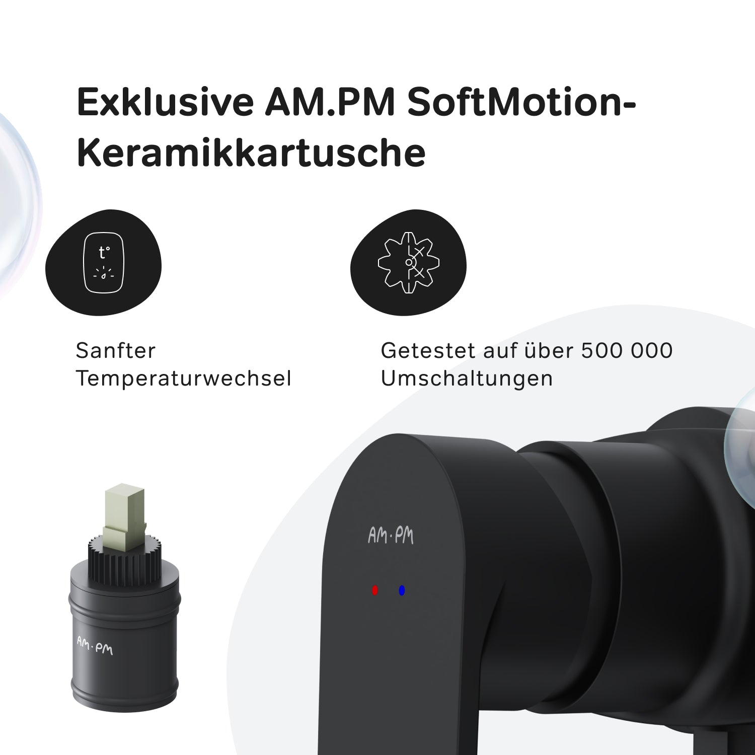 Exklusive Entwicklung: Speziell für AM.PM entwickelte SoftMotion-Keramikkartusche (Durchmesser 35 mm) sorgt für eine optimale Temperaturregelung und ermöglicht es der Armatur, auch bei Druckabfällen zu funktionieren.