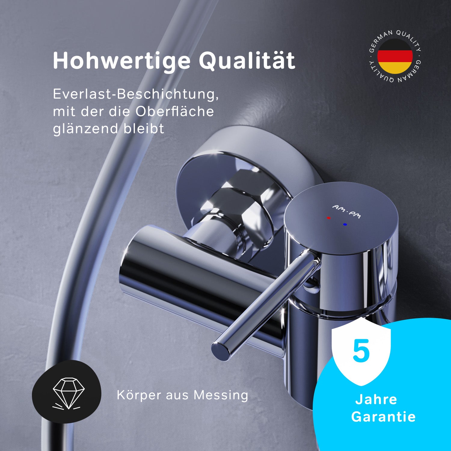 Die AM.PM Spike Duscharmatur in glänzendem Chrom vereint erstklassige Funktionalität mit stilvollem Design für Ihr Badezimmer. Diese Einhebel-Brausebatterie aus hochwertigem Chrom bietet nicht nur Langlebigkeit, sondern auch ein modernes Erscheinungsbild. Ihr Einhebel-Design ermöglicht eine präzise Steuerung von Wasserfluss und Temperatur. Die glänzende Chromoberfläche verleiht der Armatur einen zeitlosen Glanz und integriert sich perfekt in das Badezimmerambiente.