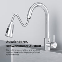 Die Armatur ist mit einem flexiblen, ausziehbaren Auslauf ausgestattet, der Aufgaben wie das Reinigen des Spülbeckens, das Befüllen großer Gefäße sowie das Waschen von Obst und Gemüse besonders erleichtert. Je nach Bedarf können Sie mühelos zwischen normalem Wasserstrahl und Brausemodus wechseln.