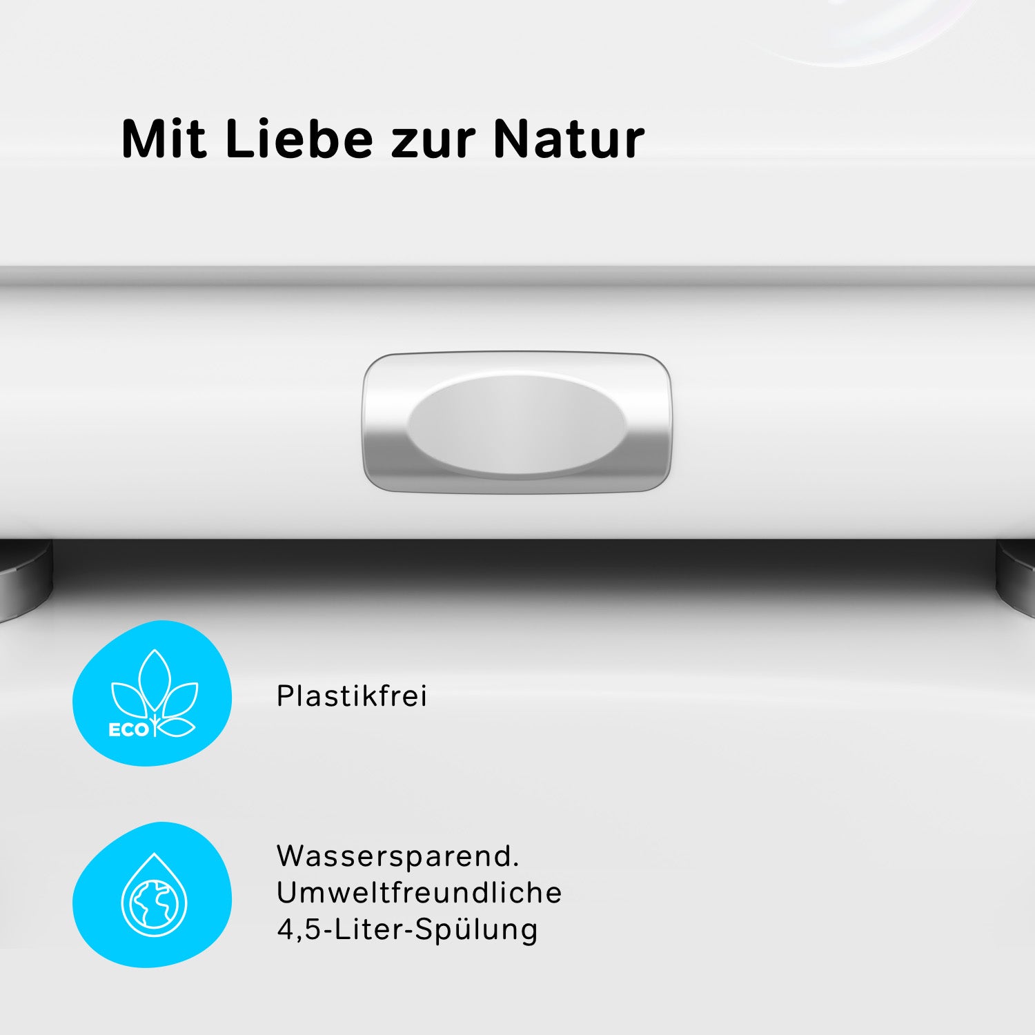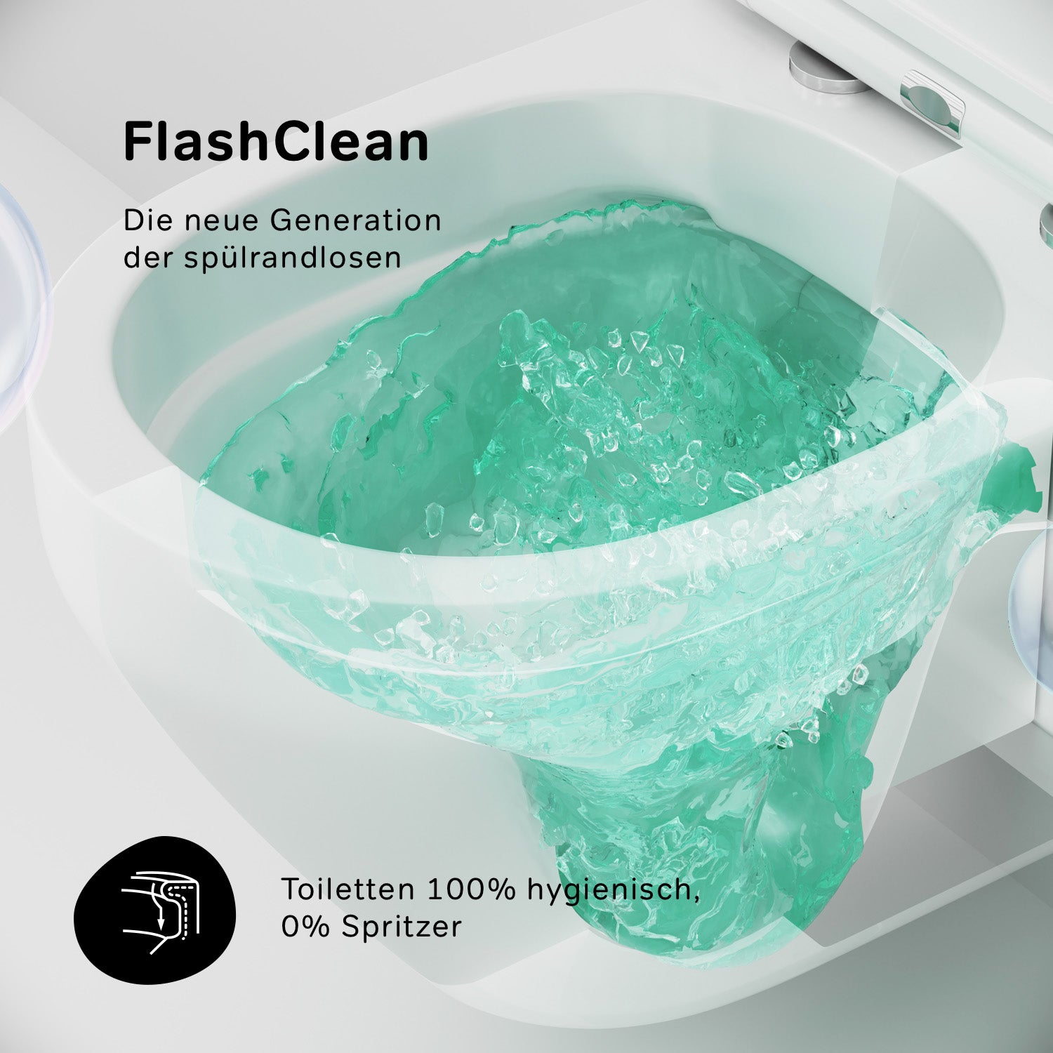 FlashClean est une nouvelle génération de toilettes sans bride et sans utilisation de plastique : 100% hygiène, 0% éclaboussures. Solution de conception peu encombrante : les toilettes s'intègrent parfaitement dans toutes les tailles de salle de bain grâce à leur longueur de 49 cm. Des supports entièrement dissimulés et un tuyau d'évacuation dissimulé garantissent la pureté esthétique du design et un entretien facile de la céramique.