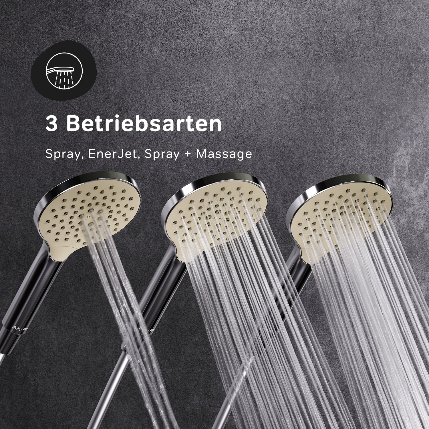 Trois modes de douchette : spray, EnerJet et spray + massage avec un commutateur innovant.