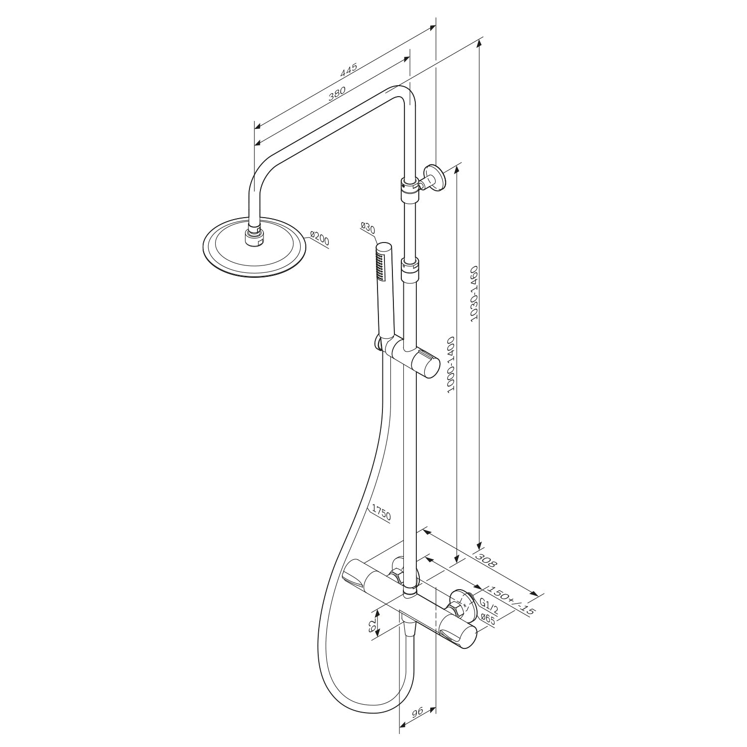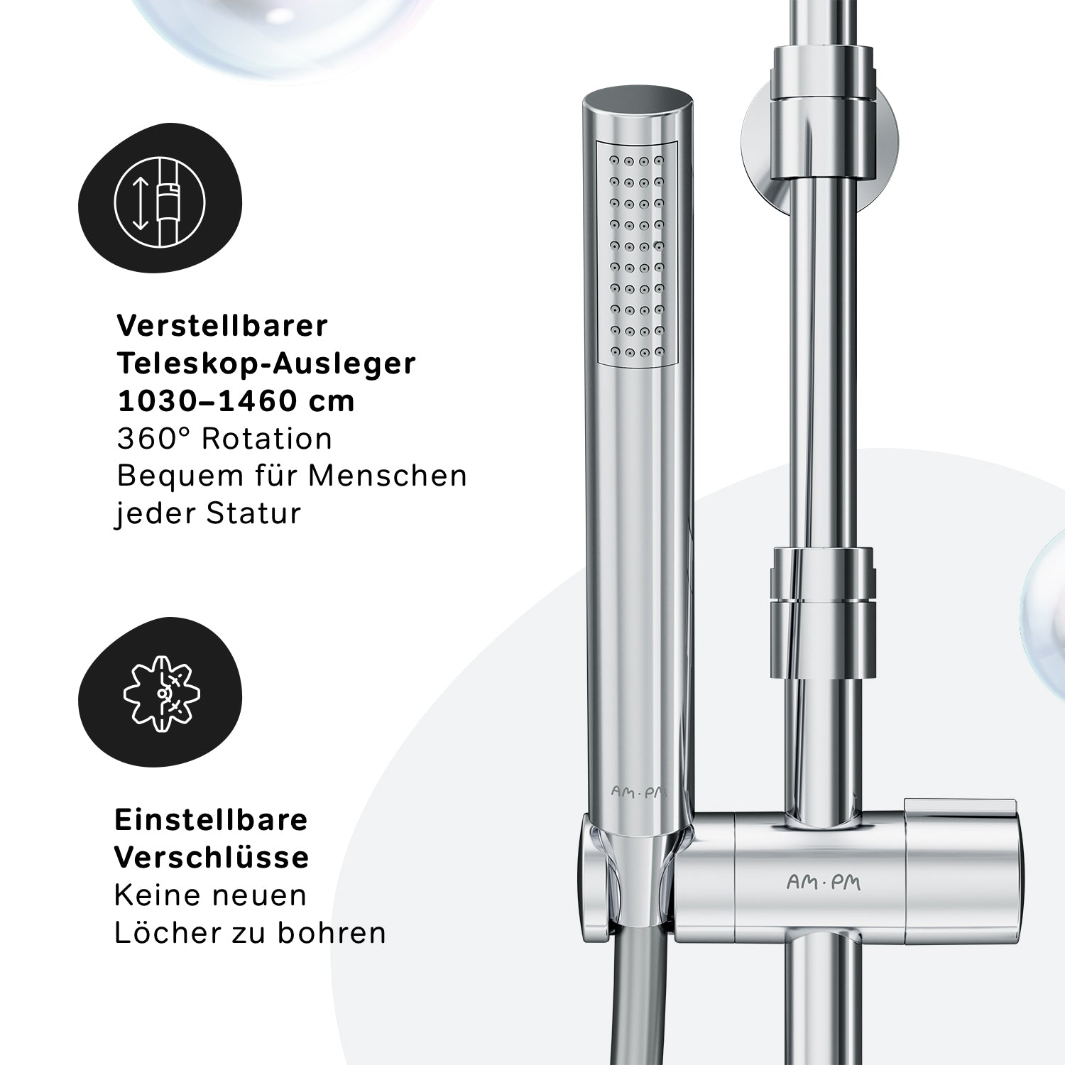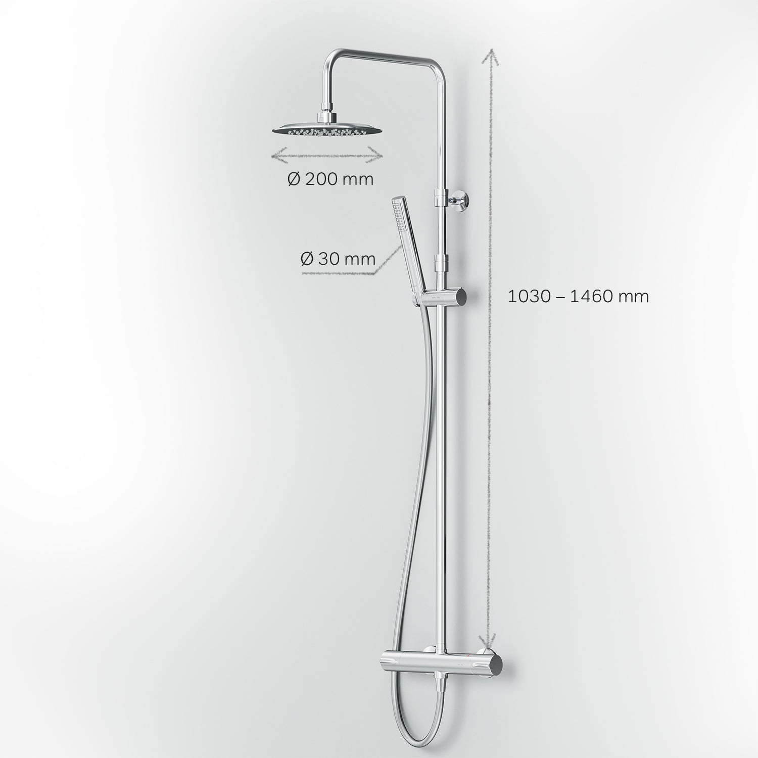 Des détails astucieux pour une utilisation facile : la barre de douche est réglable en hauteur de 1 030 à 1 460 mm, offrant un confort optimal à toutes les tailles. La rotule du support de pommeau permet de régler l'angle d'inclinaison, le flexible de douche mesure 1 750 mm de long et la douchette à main présente une forme de bâton tendance.