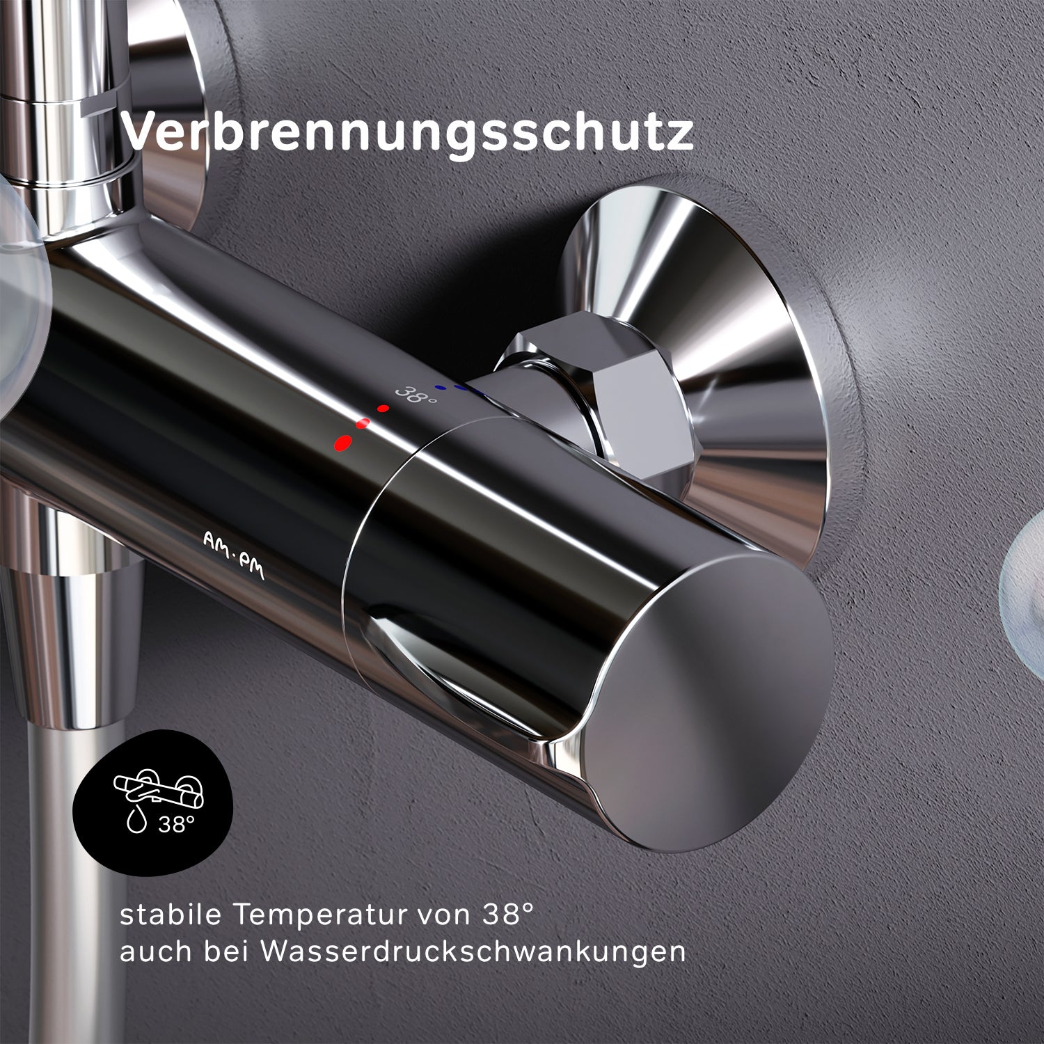 Mitigeur bain-douche avec thermostat : La cartouche thermostatique avec thermocouple très sensible, arrêt de sécurité à 38 degrés et réponse rapide aux changements de température ou de pression protège de manière fiable contre les brûlures, même en cas d'interruption soudaine de l'eau froide.