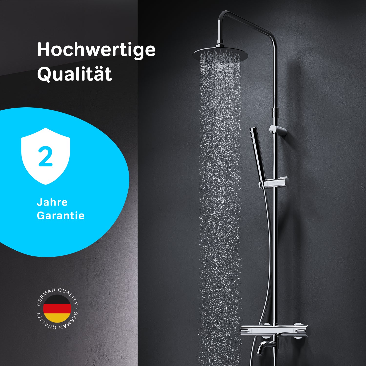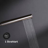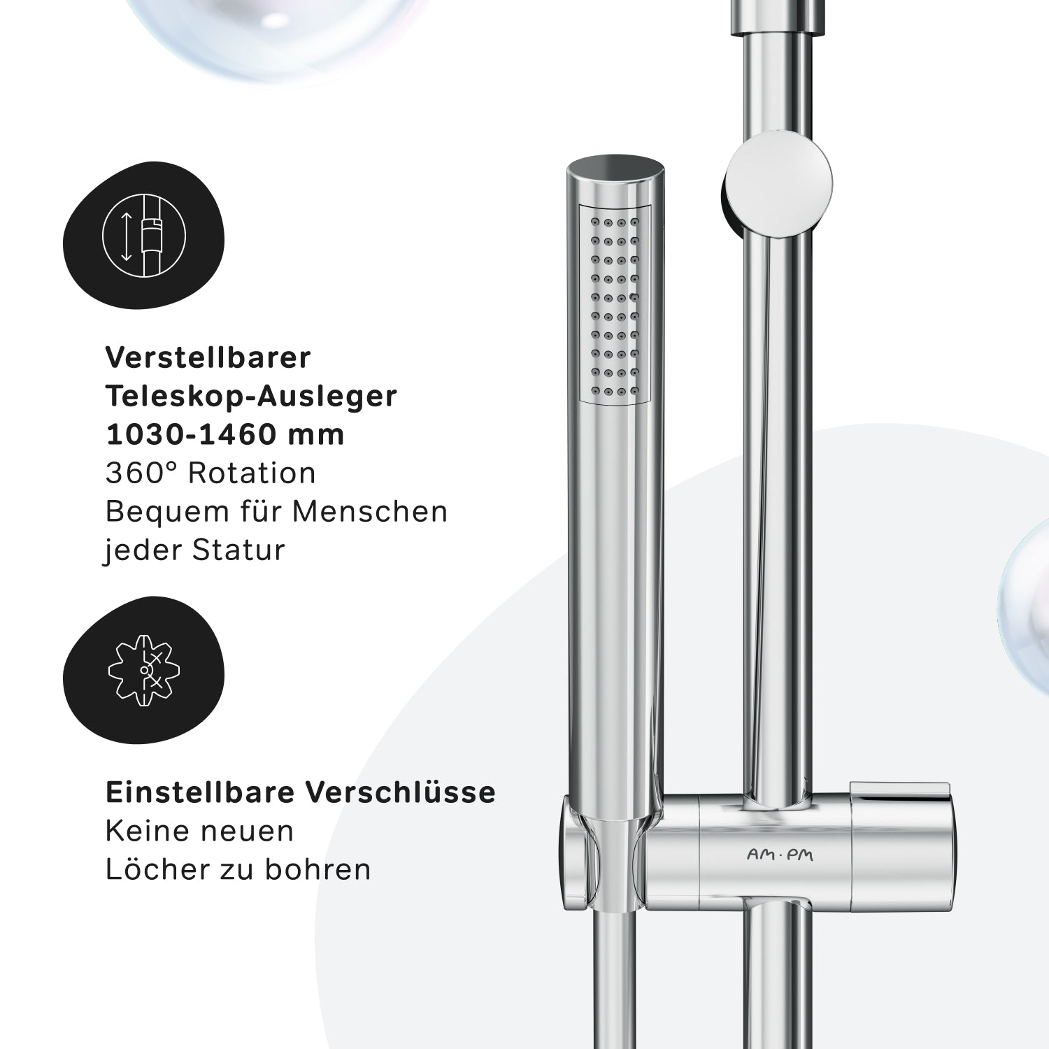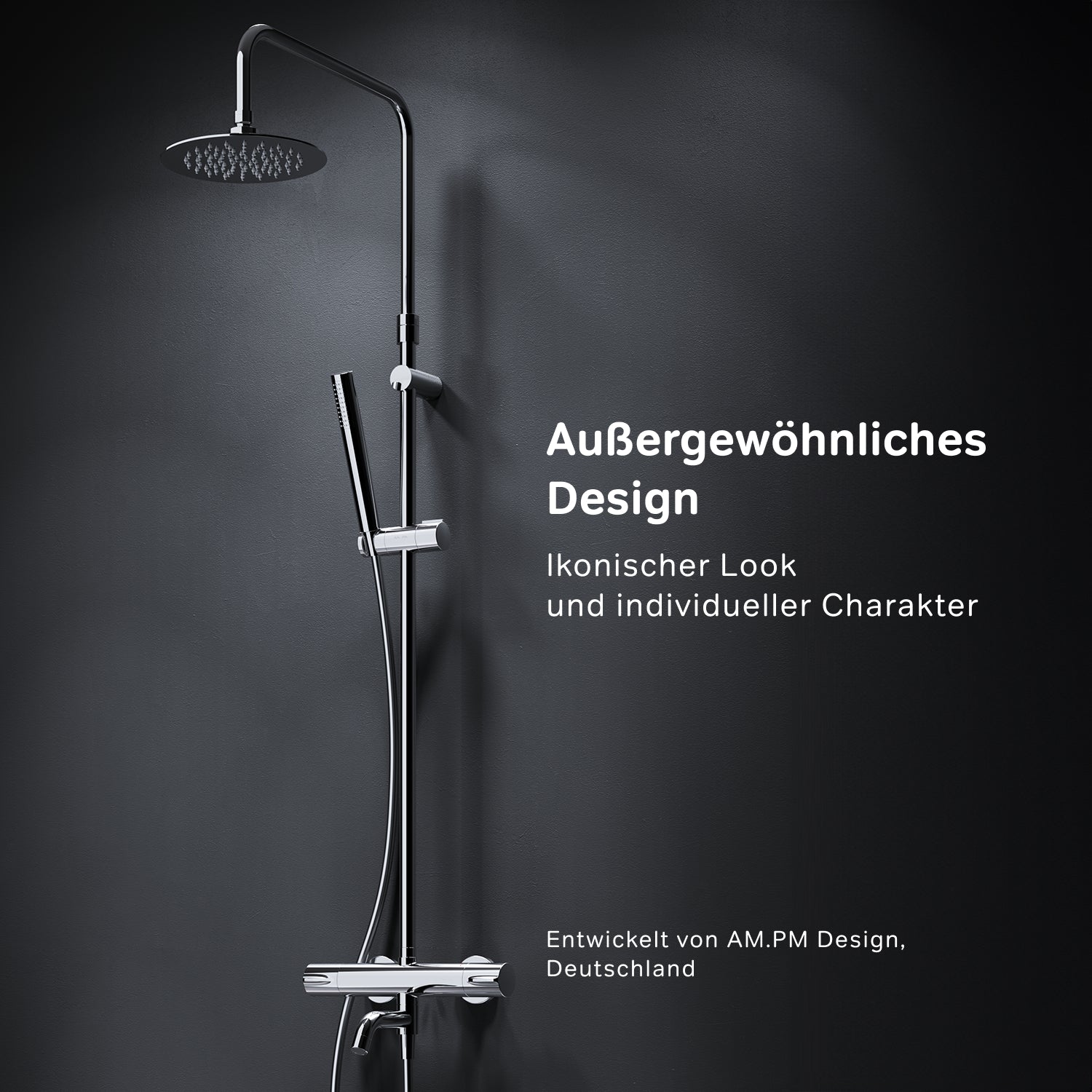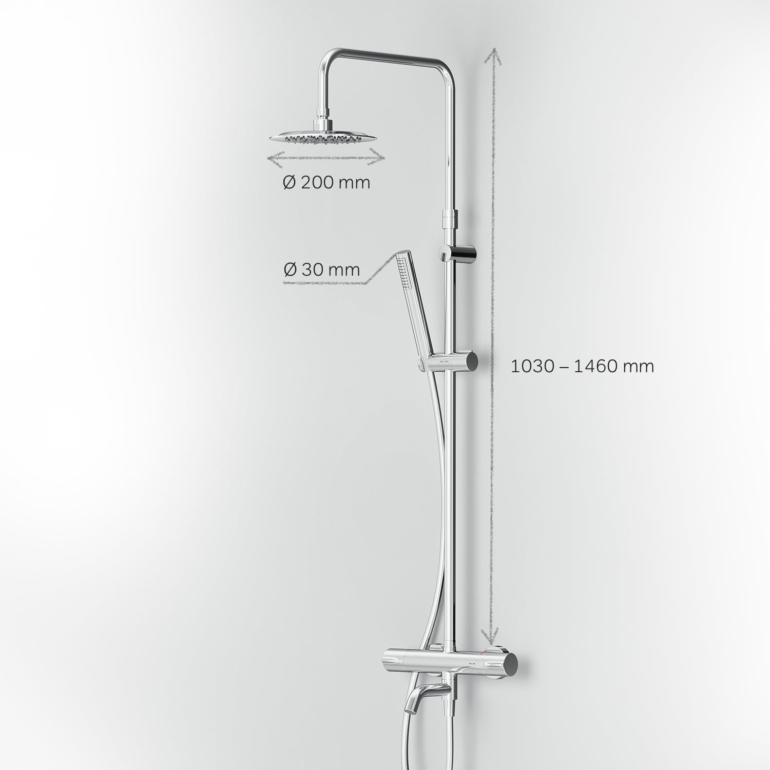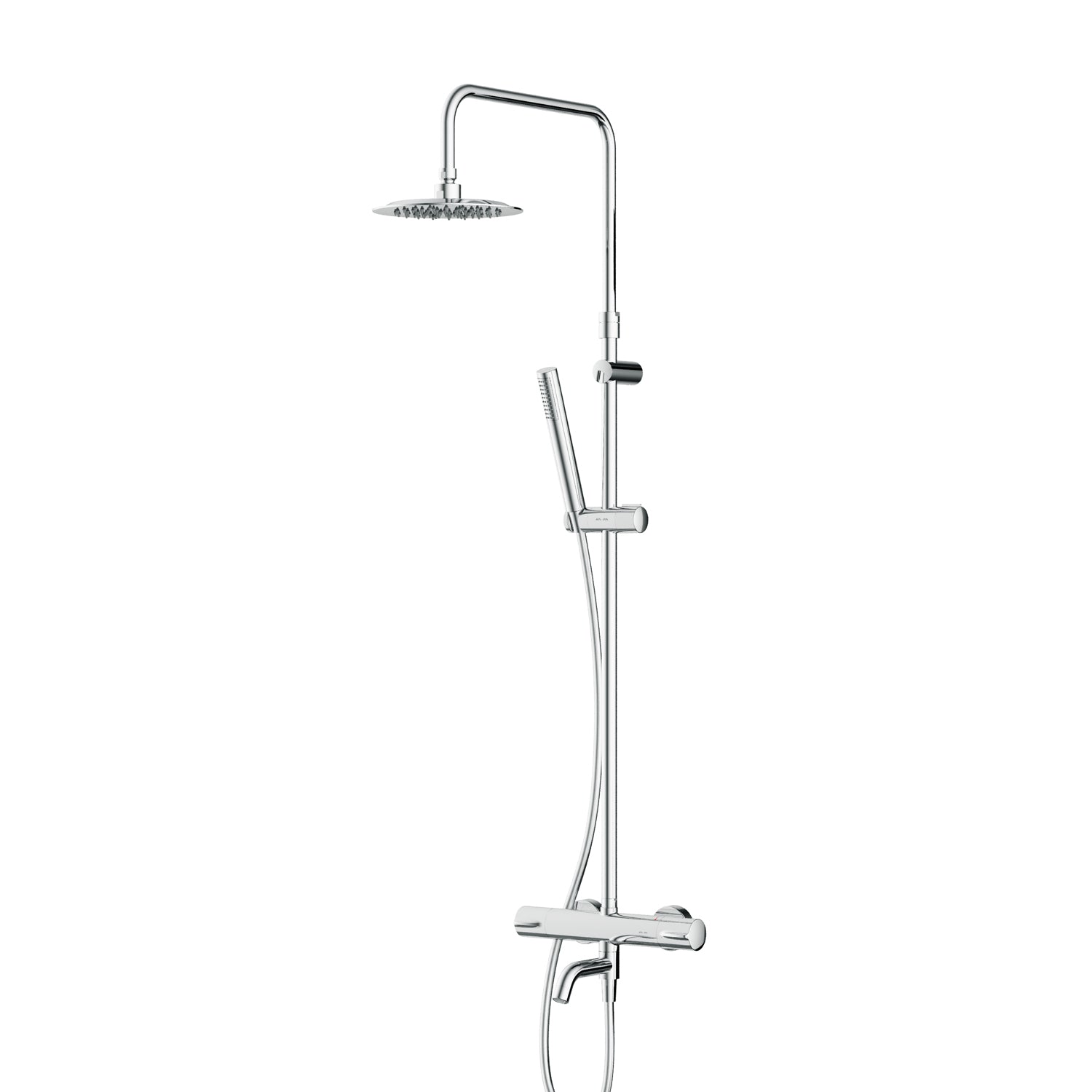 Des formes élégantes et épurées, ainsi qu'un éclat raffiné, sont les atouts majeurs d'une salle de bains moderne. Sécurité maximale : la cartouche thermostatique de 35 mm permet un réglage précis de la température et de la pression de l'eau. Réglez les réglages qui vous conviennent le mieux d'une simple rotation de la poignée du mitigeur. La douche de tête à grand diamètre et à angle réglable ainsi que la douchette à main tendance en forme de pommeau vous offrent une multitude de sensations.