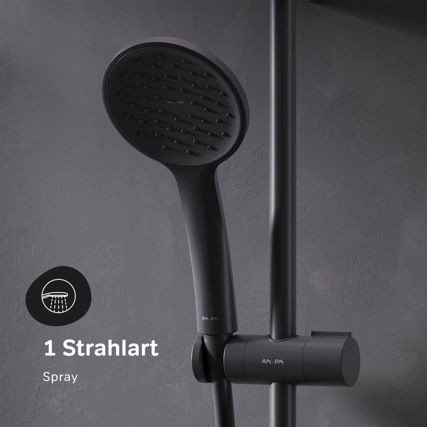 L'ensemble de douche AM. PM noir mat est un système de douche élégant et moderne sans robinet. Doté d'une pomme de douche effet pluie et d'une douchette à main, il offre une expérience de douche luxueuse. La douche de tête ronde crée un agréable effet pluie, tandis que la douchette à main offre une grande flexibilité. La colonne de douche associe harmonieusement ces éléments et s'intègre avec élégance à toute salle de bains. Sa finition mate confère à l'ensemble une touche de sophistication et s'intègre à divers styles d'intérieur. Des matériaux de haute qualité et un design raffiné garantissent durabilité et facilité d'utilisation. Cet ensemble de douche est le choix idéal pour ceux qui recherchent l'alliance de la fonctionnalité et de l'esthétique.