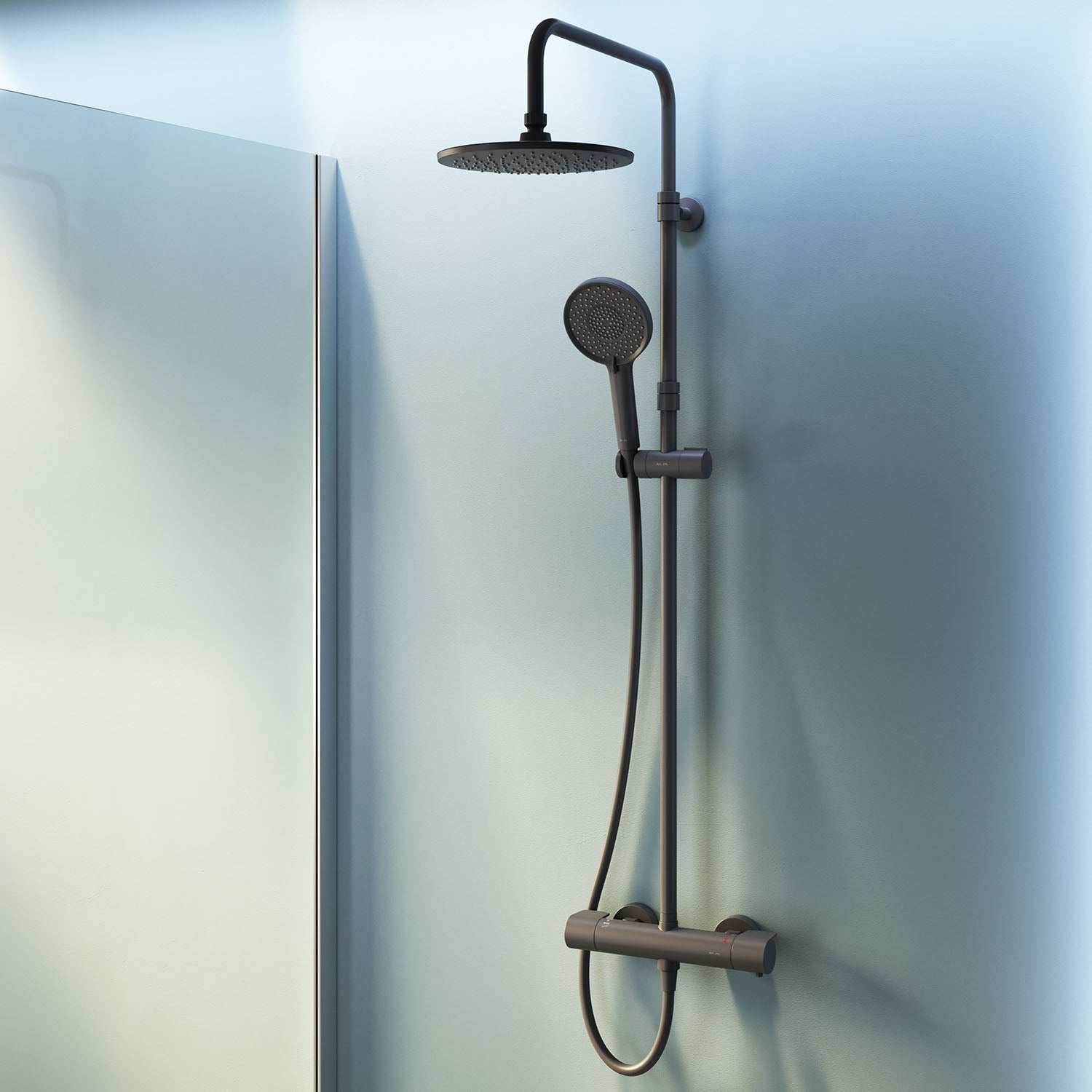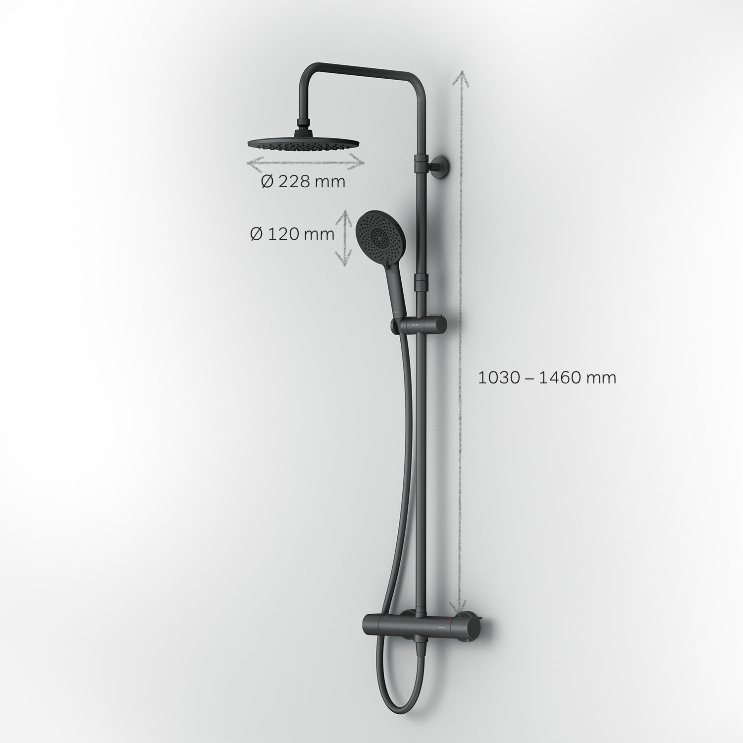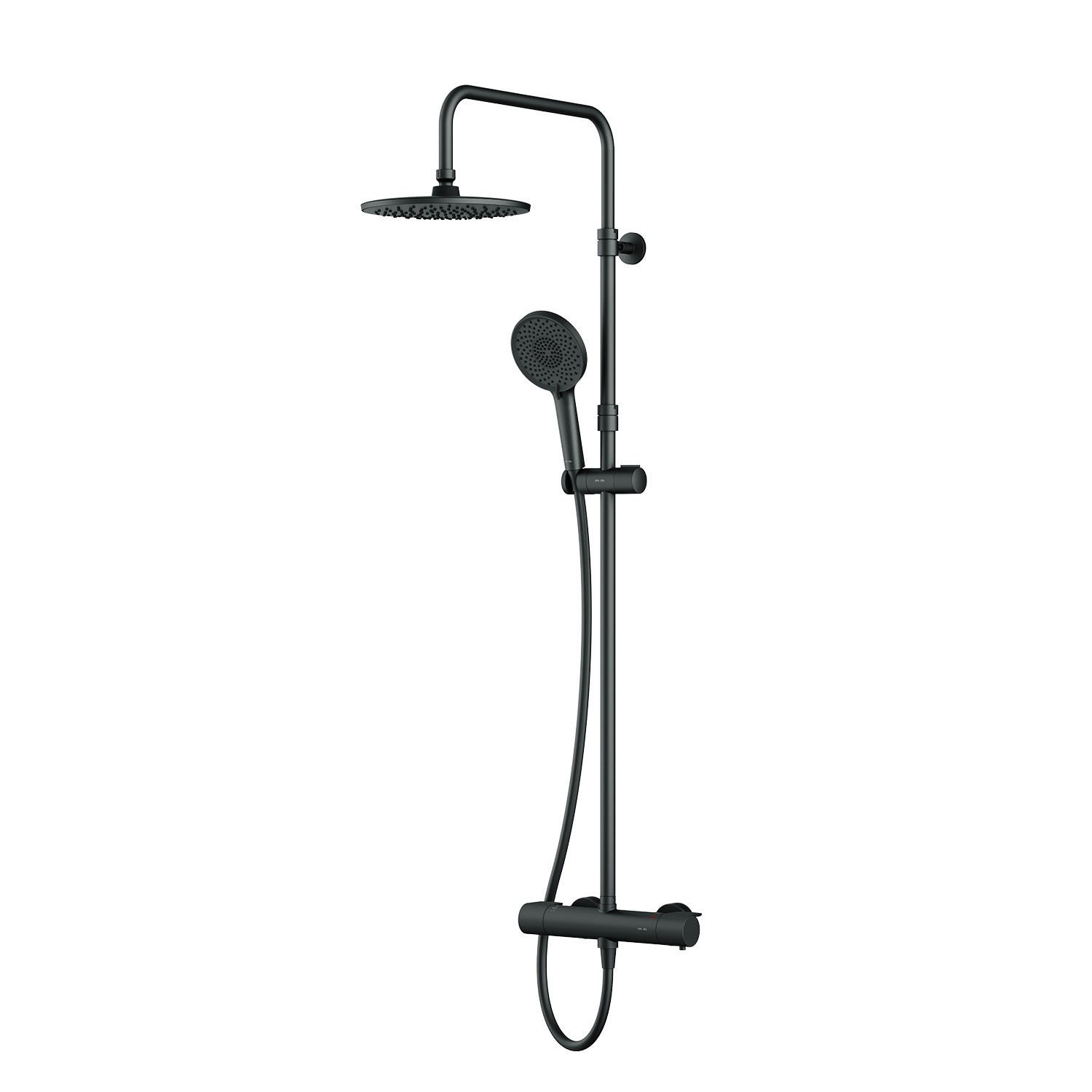 Le robinet de douche avec douche pluie et douchette transforme la douche en un vrai plaisir. La colonne de douche combine parfaitement ces éléments et donne à votre salle de bain une touche moderne. Le set de douche Thermo avec thermostat assure une température de l'eau constante et protège contre les fluctuations soudaines de température. La surface mate donne à l'ensemble une touche noble et s'intègre parfaitement à divers styles d'intérieur. Les matériaux de haute qualité sont la durabilité et la fiabilité.