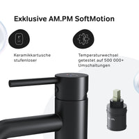 Le AM.PM Le mitigeur de lavabo Spike en noir mat allie qualité et esthétique pour votre salle de bain. Fabriqué à partir de laiton de haute qualité, ce robinet de salle de bain offre non seulement une durabilité mais également un design élégant. Doté d'un mitigeur précis pour votre évier, il permet une utilisation agréable et confortable.