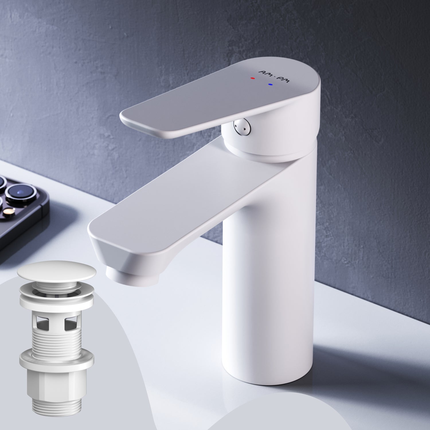 Une technologie précise pour votre confort : La température de l'eau peut être facilement contrôlée en déplaçant le levier. Cartouche céramique SoftMotion d'un diamètre de 35 mm, développée exclusivement pour AM. PM. L'eau qui circule dans l'aérateur est mélangée à de l'air pour éviter les éclaboussures. Rub&Clean maintient également l'aérateur exempt de calcaire.