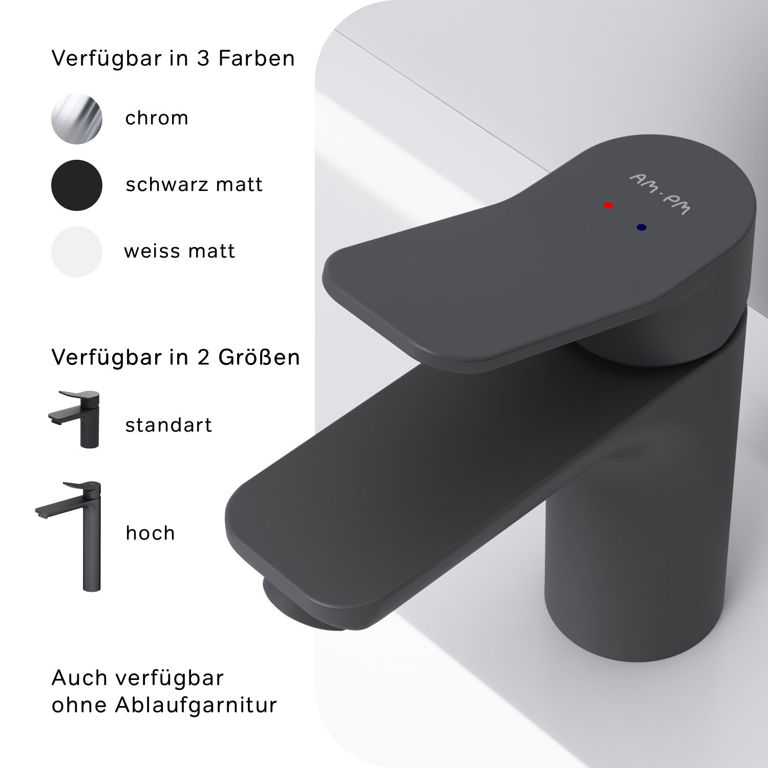 Conformément à la norme SA (SA = Smart Angle) , nous avons développé une géométrie idéale-un rapport de hauteur du robinet, de longueur du bec et d'inclinaison du corps du robinet ajusté mathématiquement pour une utilisation confortable sur des lavabos de 50 à 120 cm. Le robinet X-Joy est équipé d'une cartouche en céramique SoftMotion de 35 mm, spécialement développée pour AM. PM. Cette cartouche aide à la régulation de la température et résiste également aux fluctuations de pression. Le robinet X-Joy est fabriqué en laiton massif. La surface est également revêtue d'Everlast. Il s'agit de la norme industrielle en matière de robustesse et de durabilité.