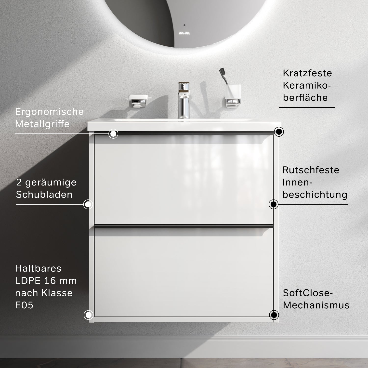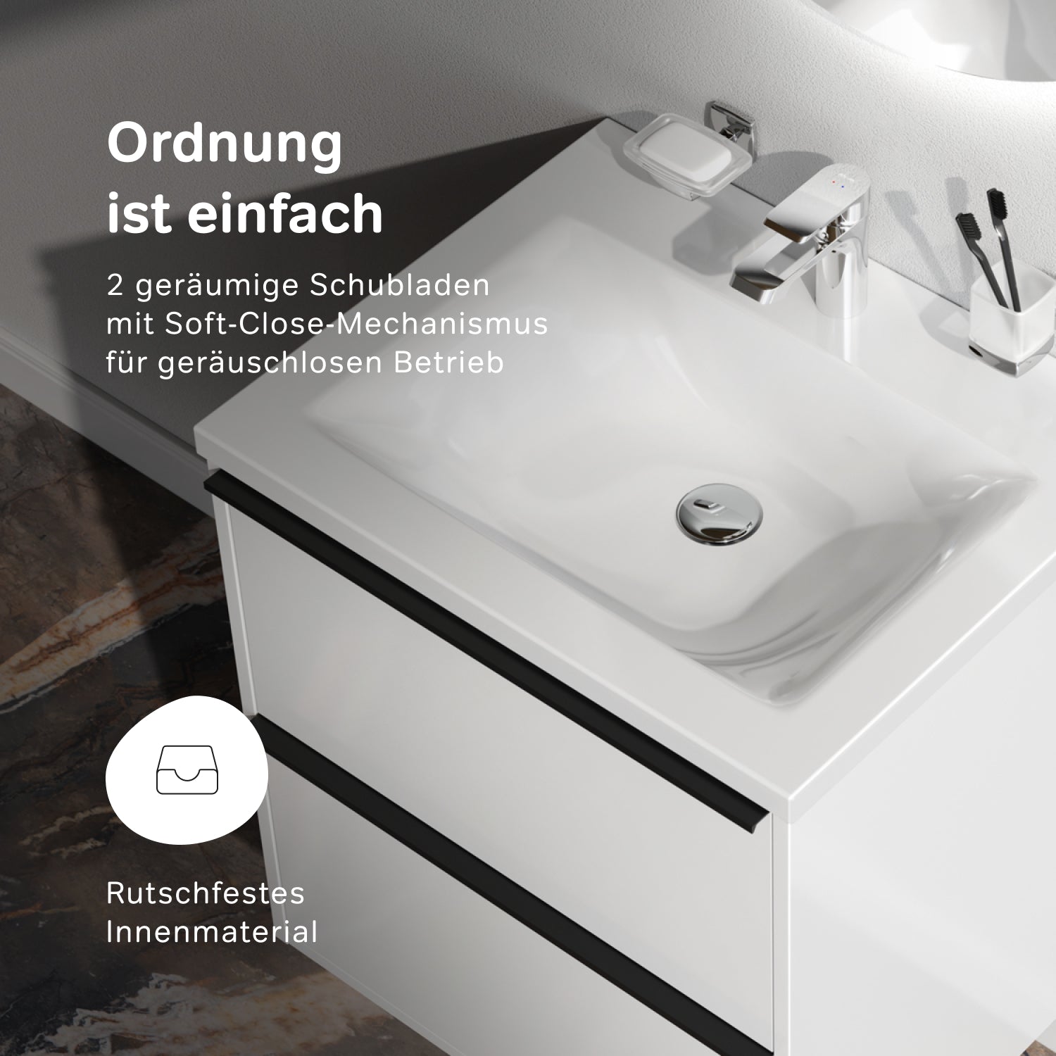 Découvrez le meuble sous-vasque suspendu avec vasque, une pièce maîtresse du design de votre salle de bains. Son design distinctif : lignes épurées, formes marquantes et ergonomie optimale. Deux tiroirs extra-larges, dotés d'un système d'organisation intérieur sophistiqué, offrent encore plus d'espace et une organisation optimale. Un revêtement intérieur antidérapant et une découpe spéciale pour le raccordement du siphon complètent ce concept sophistiqué. Le meuble bas est fabriqué à partir de matériaux robustes et offre une durabilité exceptionnelle.