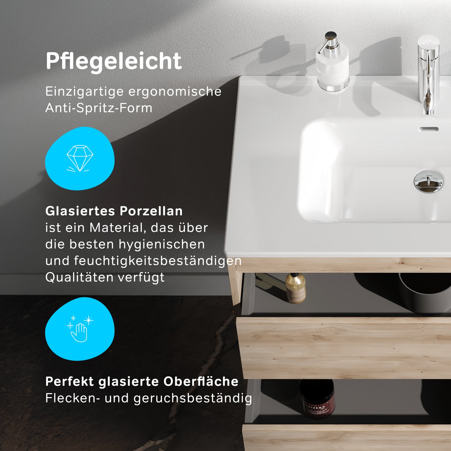 Pour un espace de rangement supplémentaire, le meuble bas est équipé d'un lavabo fonctionnel et élégant. Son large rebord permet de ranger articles de toilette, distributeur de savon ou porte-savon : tout est à portée de main. Le trop-plein rectangulaire évacue l'excès d'eau vers la bonde, gardant la surface sèche et propre, tandis que la forme profonde du lavabo prévient les éclaboussures.