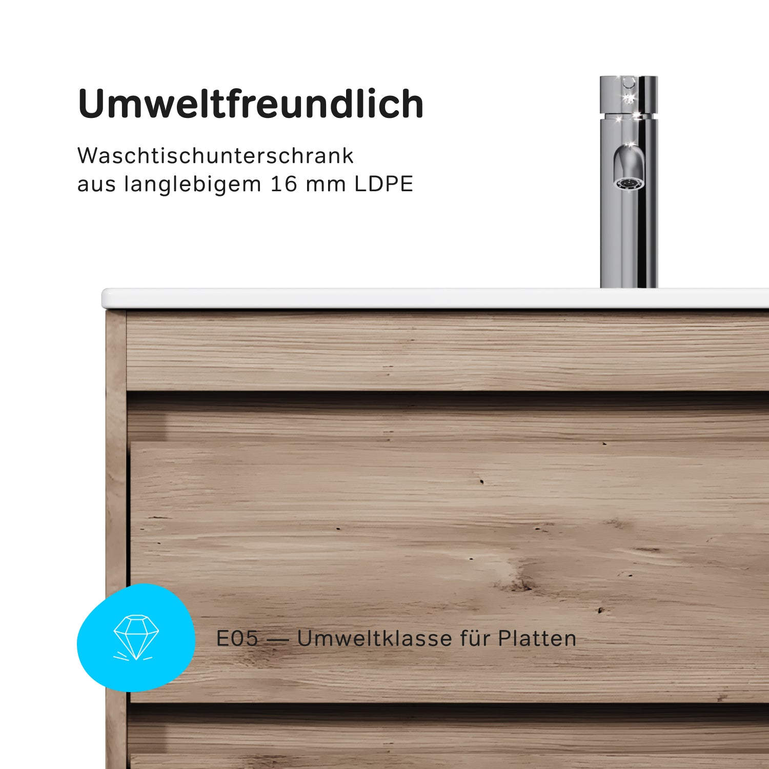 À l'intérieur du meuble, des guides-câbles astucieusement intégrés simplifient l'installation sans compromettre l'esthétique de la salle de bains. Fabriqué en aggloméré stratifié résistant à l'humidité, le meuble bas est à la fois pratique et durable. Ses dimensions compactes le rendent idéal pour les petites salles de bains où chaque centimètre compte.