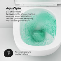 Au-dessus des toilettes suspendues dotées de la technologie de chasse d'eau AquaSpin : ce nouveau système innovant utilise un jet d'eau tourbillonnant pour un nettoyage optimal de la cuvette.
