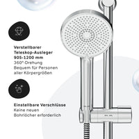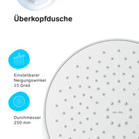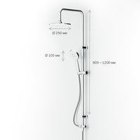 La pomme de douche de plafond surdimensionnée de 250 mm de diamètre offre une véritable sensation de pluie tropicale. Le flexible extra-long de 1750 mm assure une liberté de mouvement totale sous la douche. La douchette à main a un diamètre de 105 mm. La barre de douche télescopique et pivotante est réglable en hauteur de 905 mm à 1200 mm, pour un confort optimal quelle que soit votre morphologie. Le support à roulement à billes de la pomme de douche de plafond permet un réglage précis de l'angle.