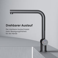 La fonction EcoStart–un atout élégant et écologique pour votre maison : en position centrale, l'eau froide coule automatiquement. Pour l'eau chaude, tournez le levier vers la gauche ; le bloquer en le tournant vers la droite. En optimisant l'amplitude de mouvement, vous pouvez réduire votre consommation d'eau jusqu'à 40 % par mois. Autre avantage : la possibilité de fixer le robinet directement au mur, idéal pour les petites cuisines.