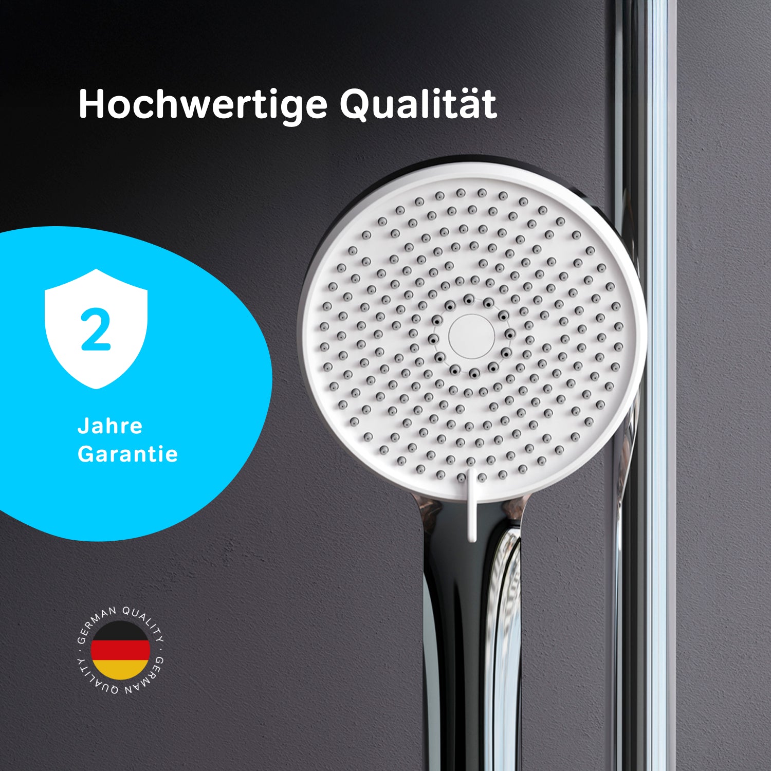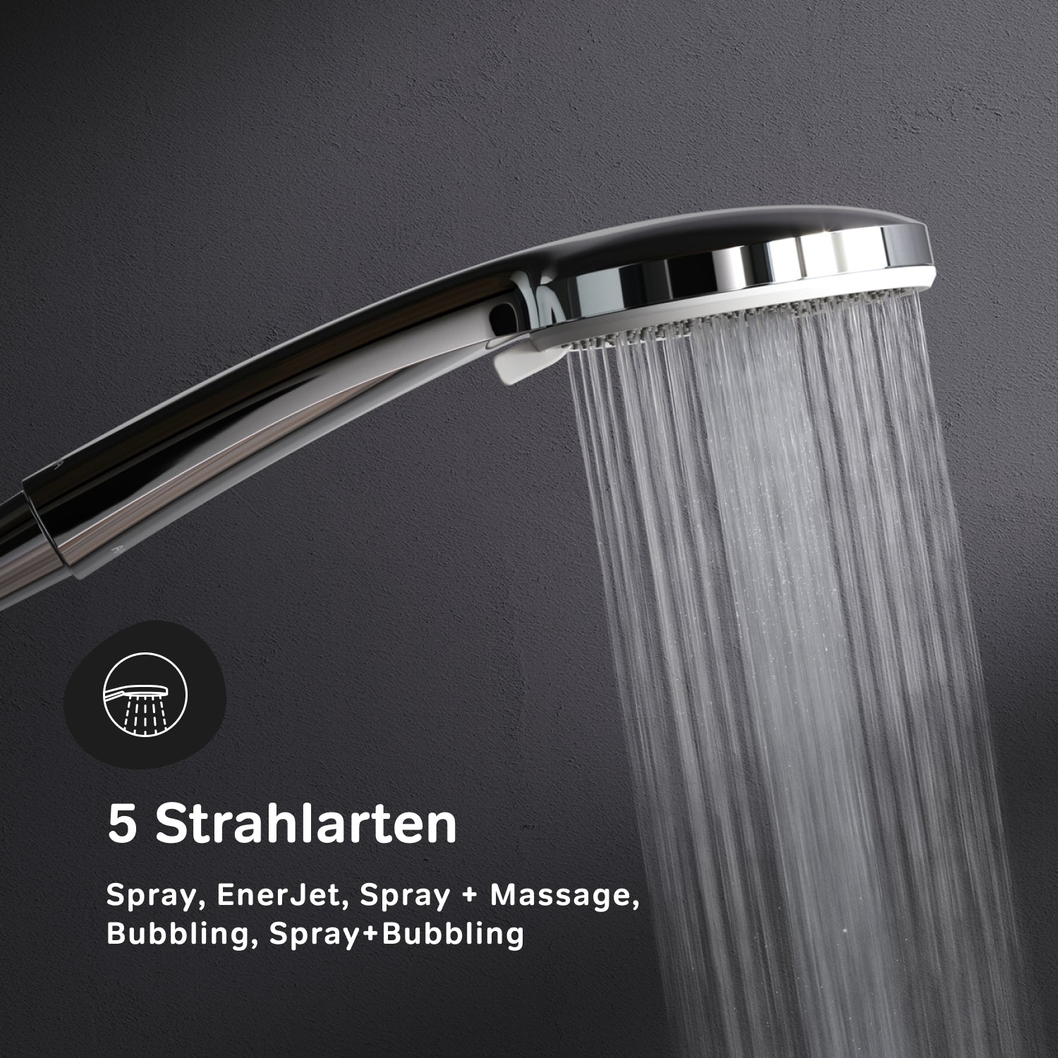 Erleben Sie alle Vorteile eines Premiumprodukts: eine vergrößerte Brause (105 mm) und 5 Strahlarten der Handbrause – Spray, EnerJet, Spray+EnerJet, Massage, Spray+Massage – für maximales Duschvergnügen.