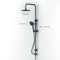 Der übergroße Deckenbrausekopf mit einem Durchmesser von 250 mm sorgt für ein authentisches Tropenregen-Erlebnis. Der besonders lange, 1750 mm lange Schlauch ermöglicht uneingeschränkte Bewegungsfreiheit unter der Dusche. Der Handbrausekopf hat einen Durchmesser von 105 mm. Die teleskopische, schwenkbare Duschstange ist stufenlos in der Höhe von 905 mm bis 1200 mm verstellbar – für optimalen Komfort bei jeder Körpergröße. Der kugelgelagerte Halter der Deckenbrause erlaubt eine präzise Winkelverstellung.